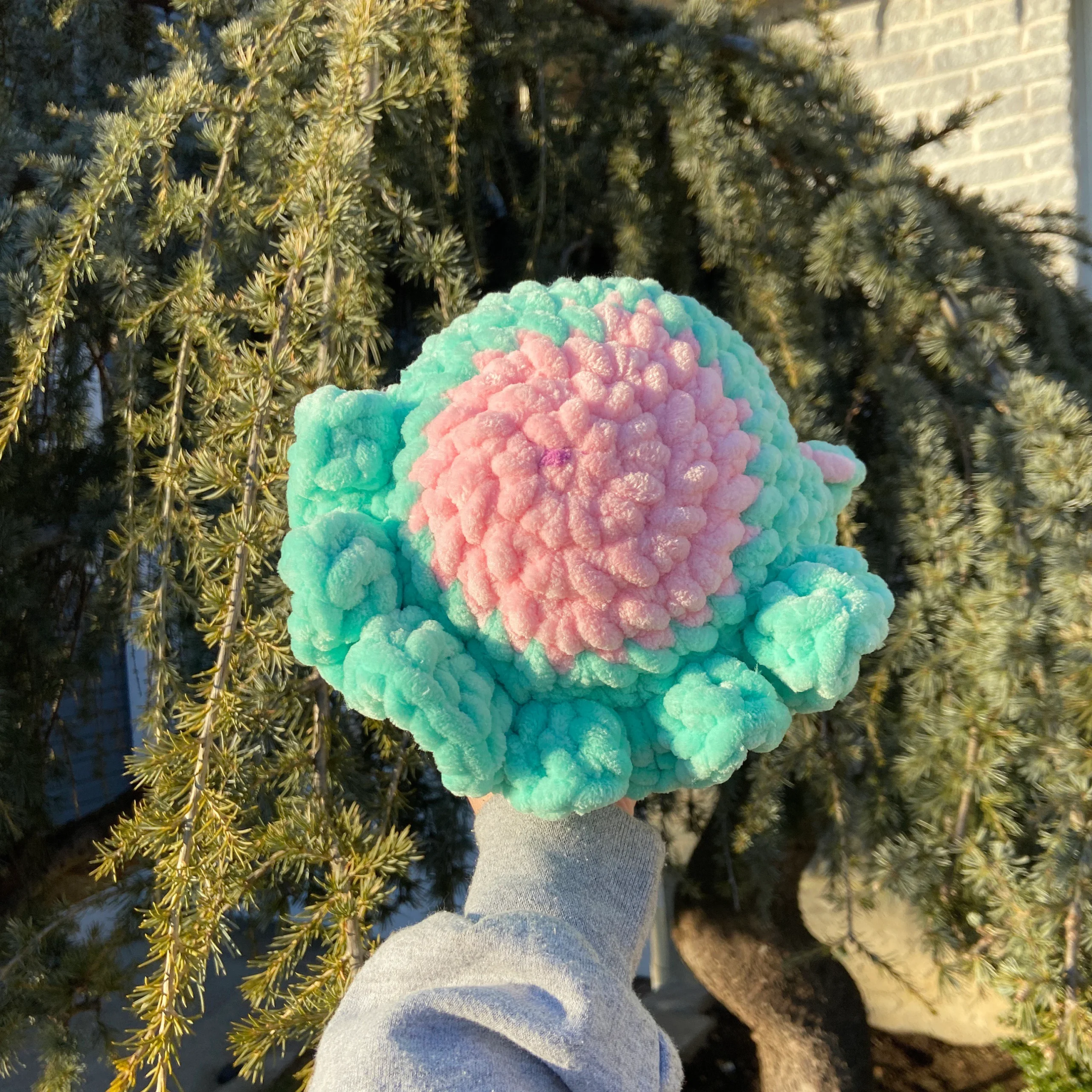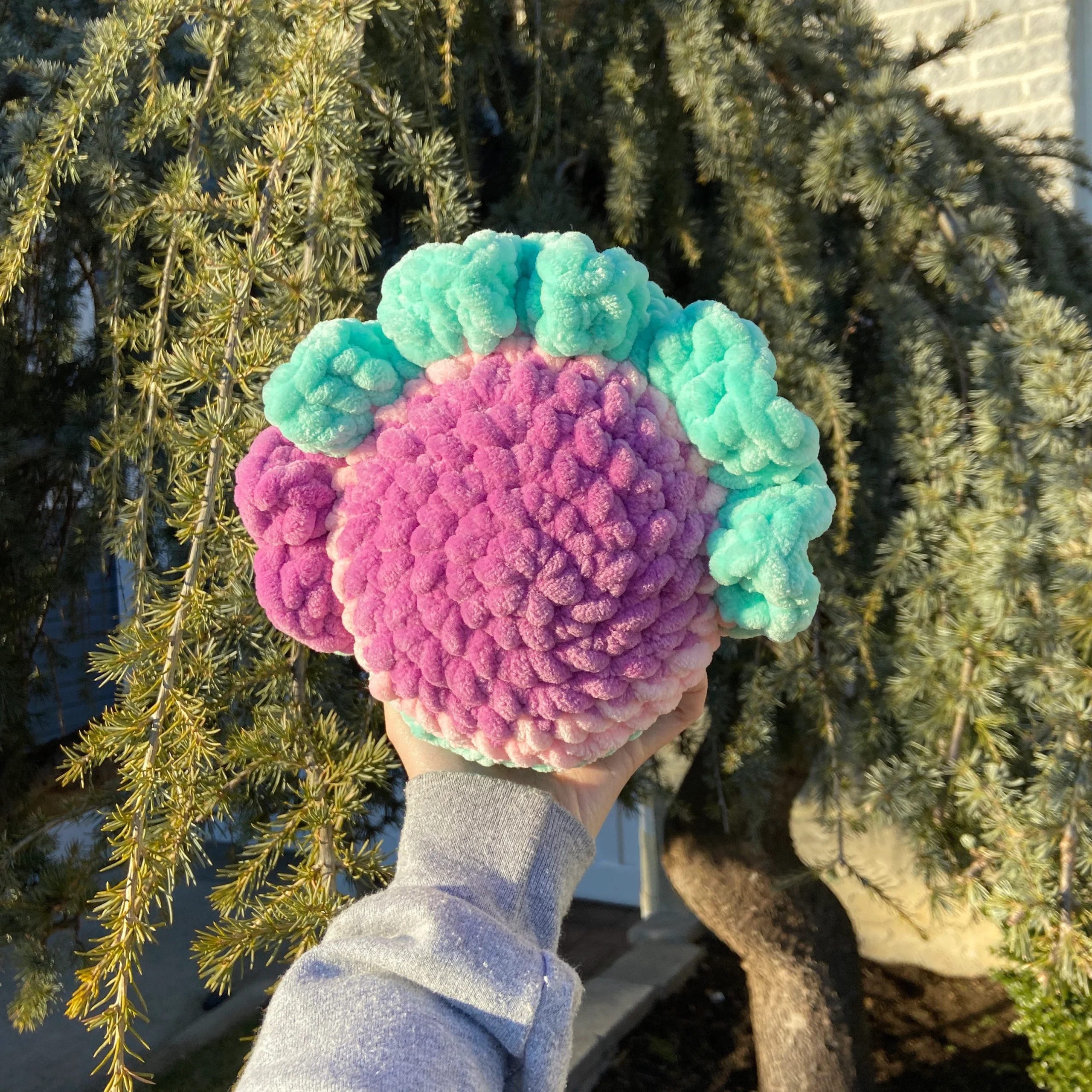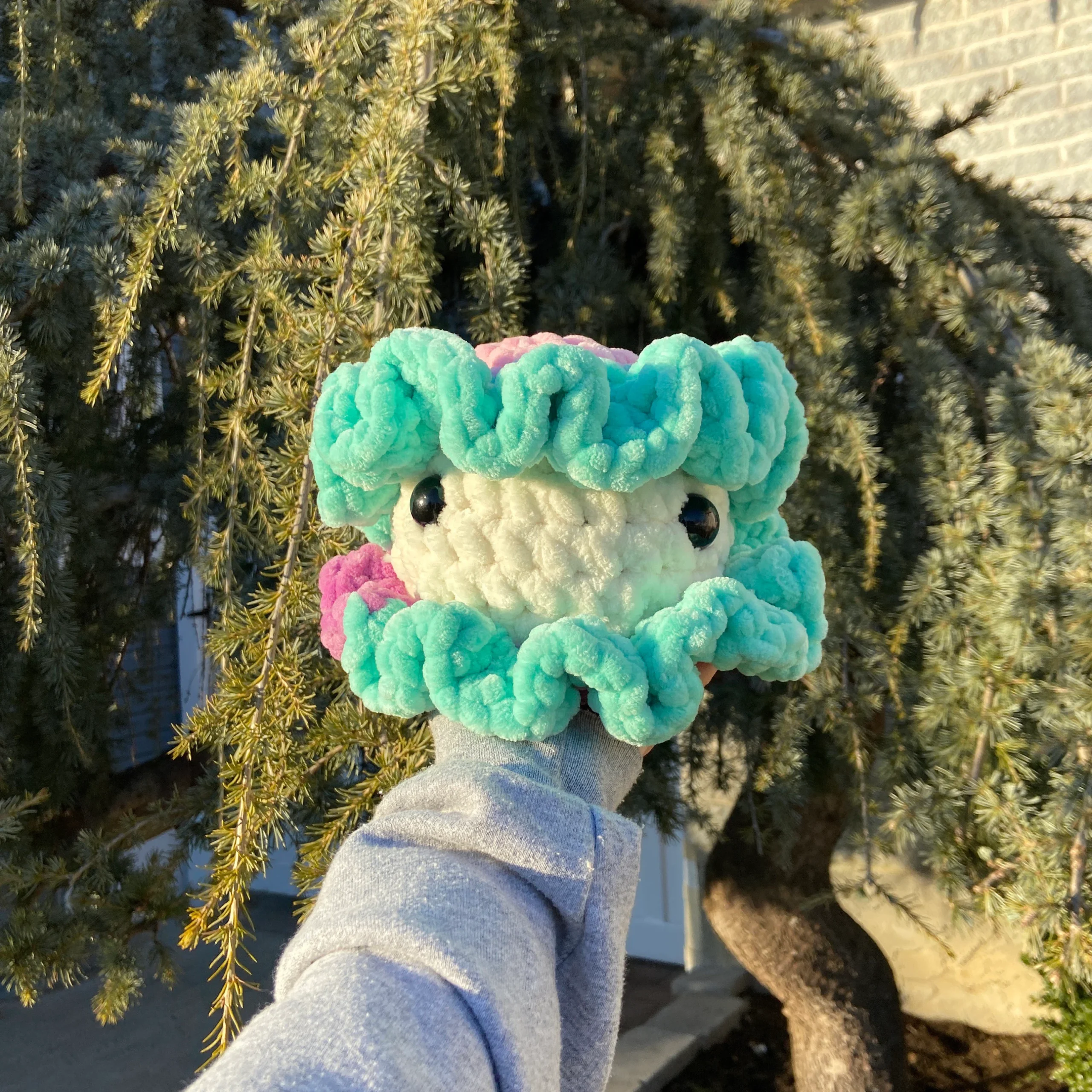 Adorable crocheted oyster! Multicolored shell containing pink, purple, and mint. This cutie can be the perfect gift, toy, or decoration!
