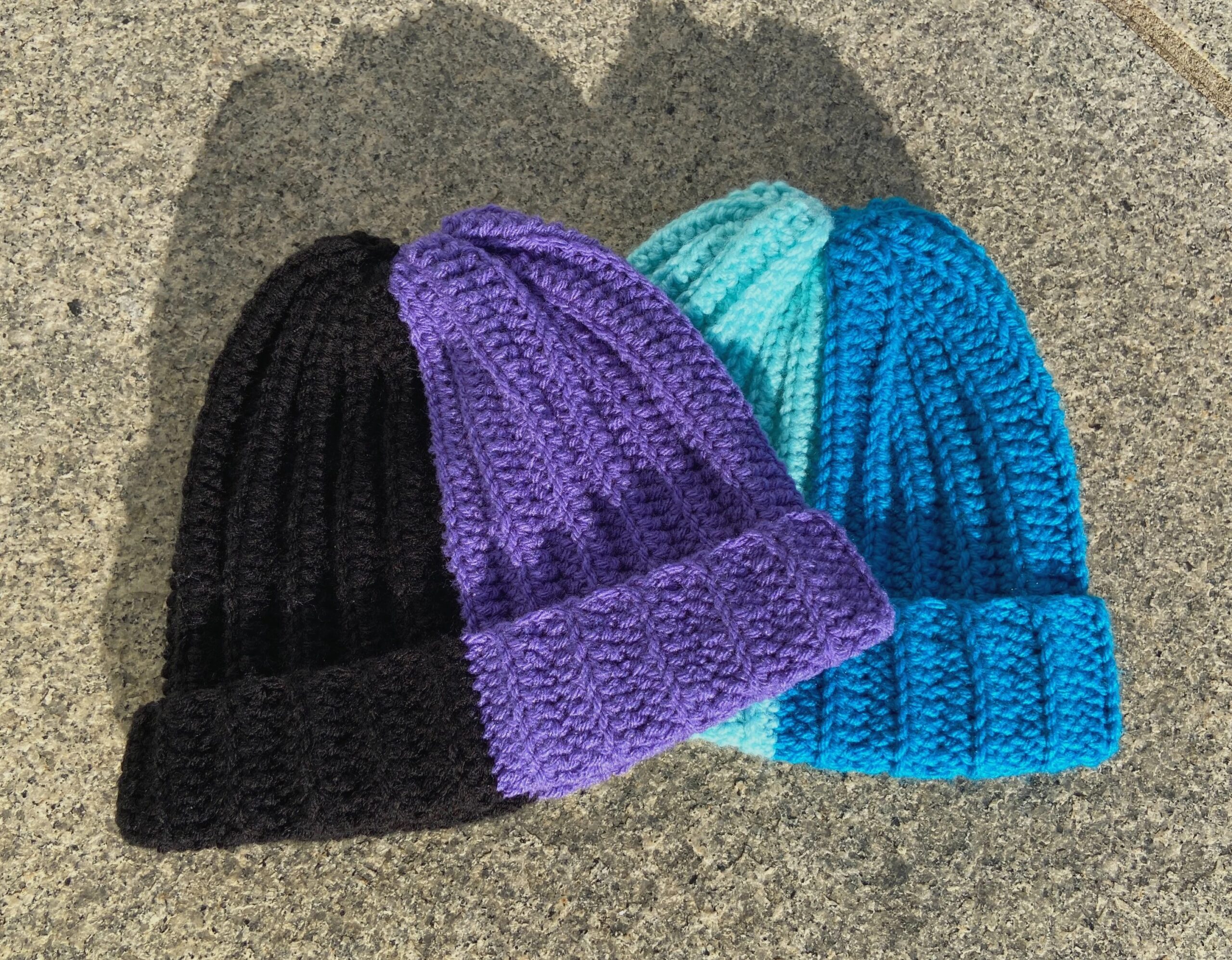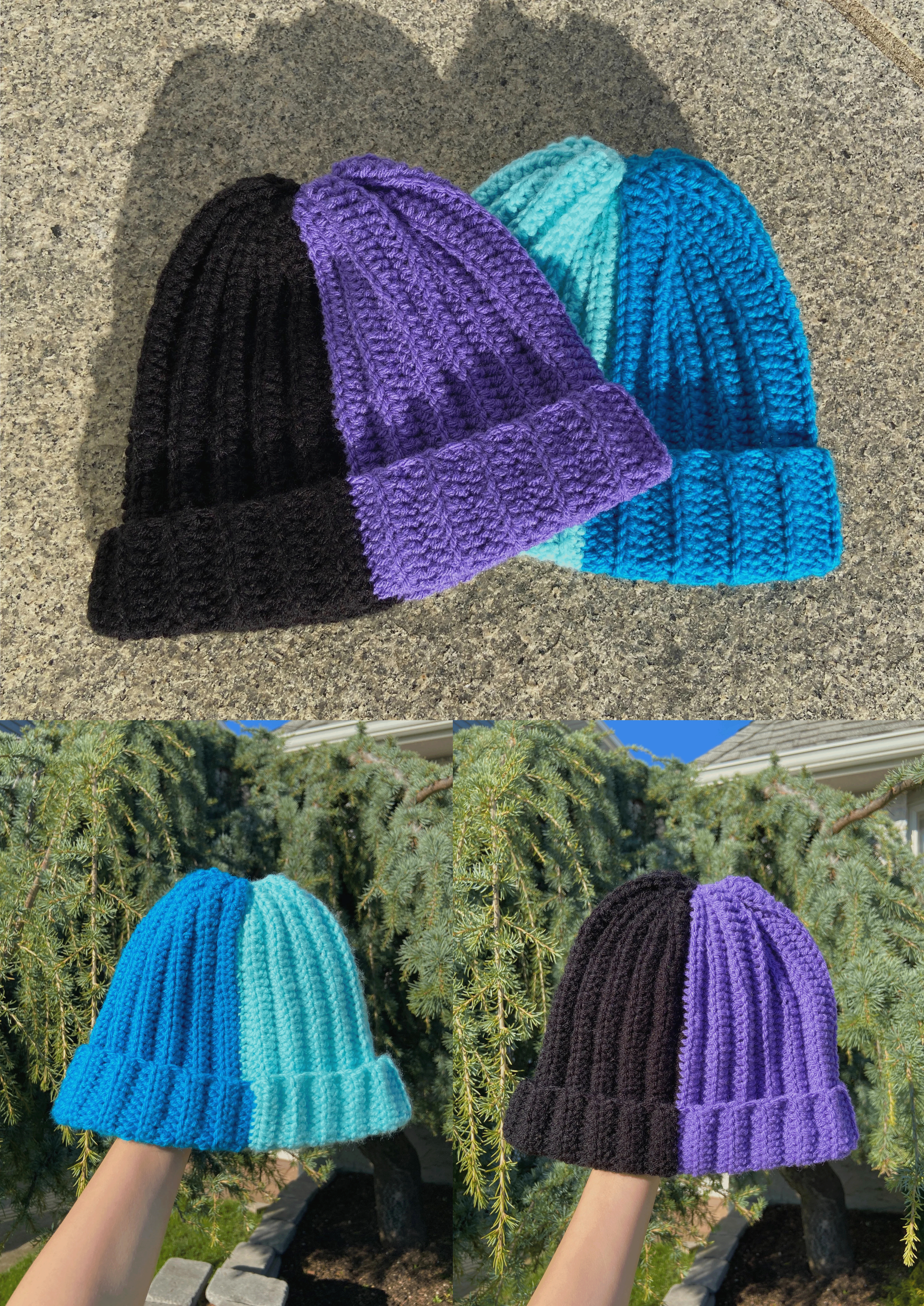 Handmade crocheted two-toned beanies! These hats are made out of 100% acrylic yarn and can be customized to any two colors of your liking. They are perfect to keep you warm in the cold winter months!